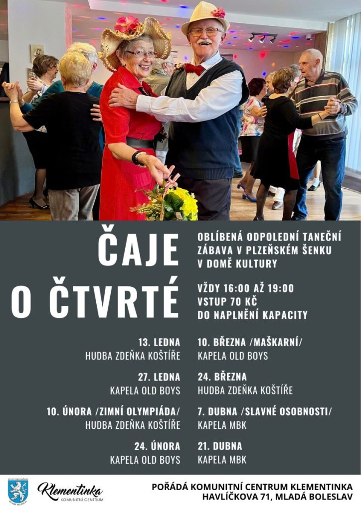 Další Čaje o čtvrté se konají na témže místě 24. února od 16 do 19 hodin a zahraje kapela Old Boys, stejně jako o čtrnáct dní později, kdy se můžete těšit na maškarní vydání se soutěží o nejlepší masku. Vstup 70 Kč.